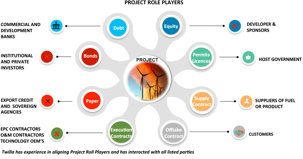 Experienced individuals with good understanding of what is needed to fast track private projects to financial close. Strong ability to identify, understand and accelerate private projects from inception through the various stages of development to construction and operations and maintenance. Twilla is not a developer but assists entrepreneurs, developers and organisations in providing guidance to progress their projects cost effectively, systematically and efficiently”